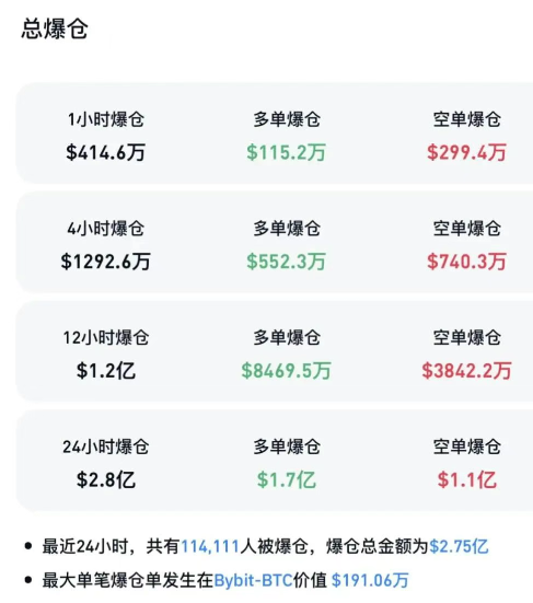 据中国基金报,Coinglass数据显示,过去24小时加密货币市场共有超11万人被爆仓,爆仓总金额为2.75亿美元(约合人民币20亿元),其中多单爆仓1.7亿美元,空单爆仓1.1亿美元。