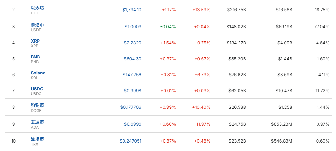 加密货币市场多数走高,以太坊、狗狗币均实现上涨。
