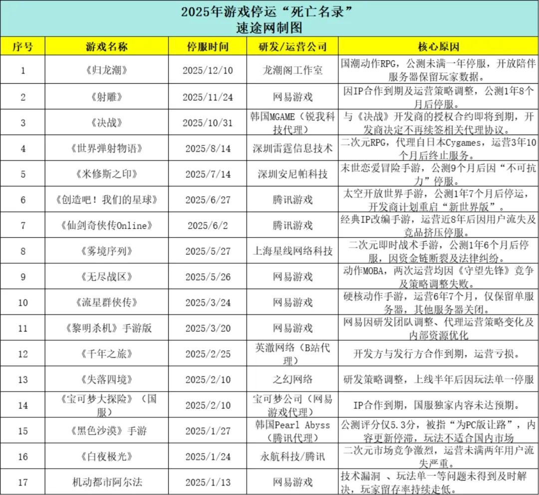 这都是游戏厂商公告里面他们自己说的,速途网就是做个总结,我问了一些停运游戏的老板,他们说:一切“死法”以官方公告为准。
