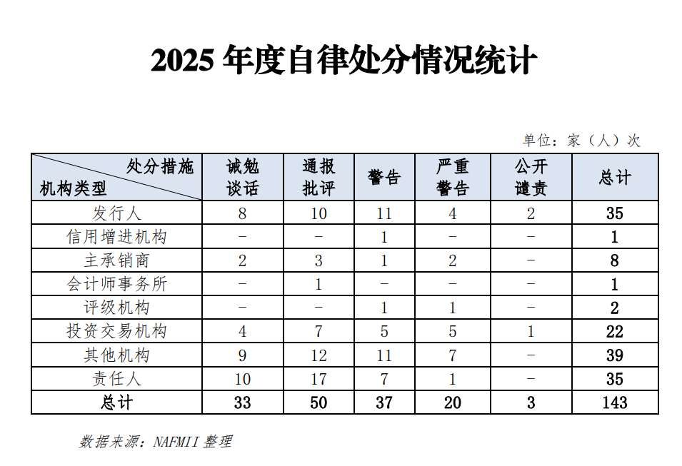 从处分对象来看,2025年对发行人自律处分35次,对信增机构自律处分1次,对主承销商自律处分8次,对评级机构自律处分2次。